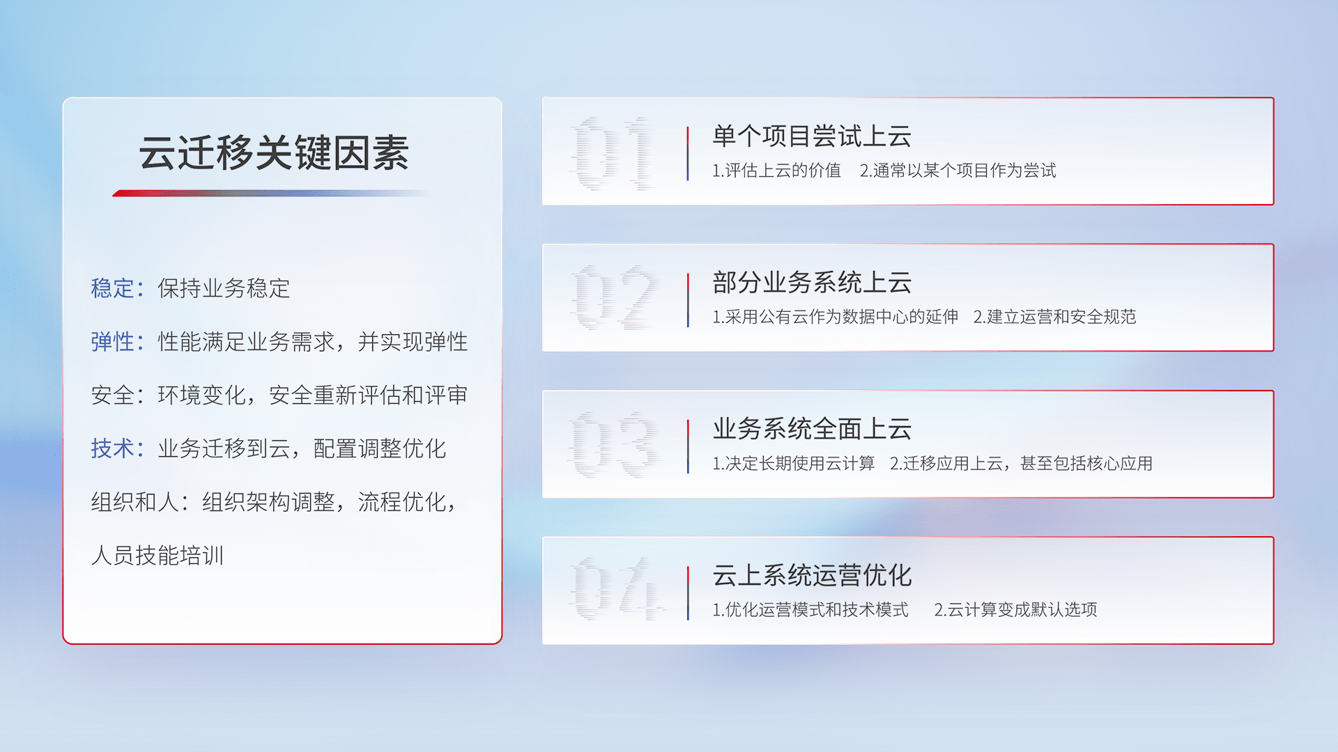 结合实际业务,,,,从规划设计、、云平台选型、、、云原生改造、、、数据迁移、、集成交付,,迁移全过程为客户识别最佳上云路径,,,做好风险识别管理,,,,设计网络架构、、、身份权限、、、安全审计合规、、、、操作审计、、日志审计、、、监控告警策略、、、、多站点容灾设计等,,对云上基础设施进行整体规划,,提升IT治理水平,,以满足弹性、、、、高可用、、高性能的需求。。。。