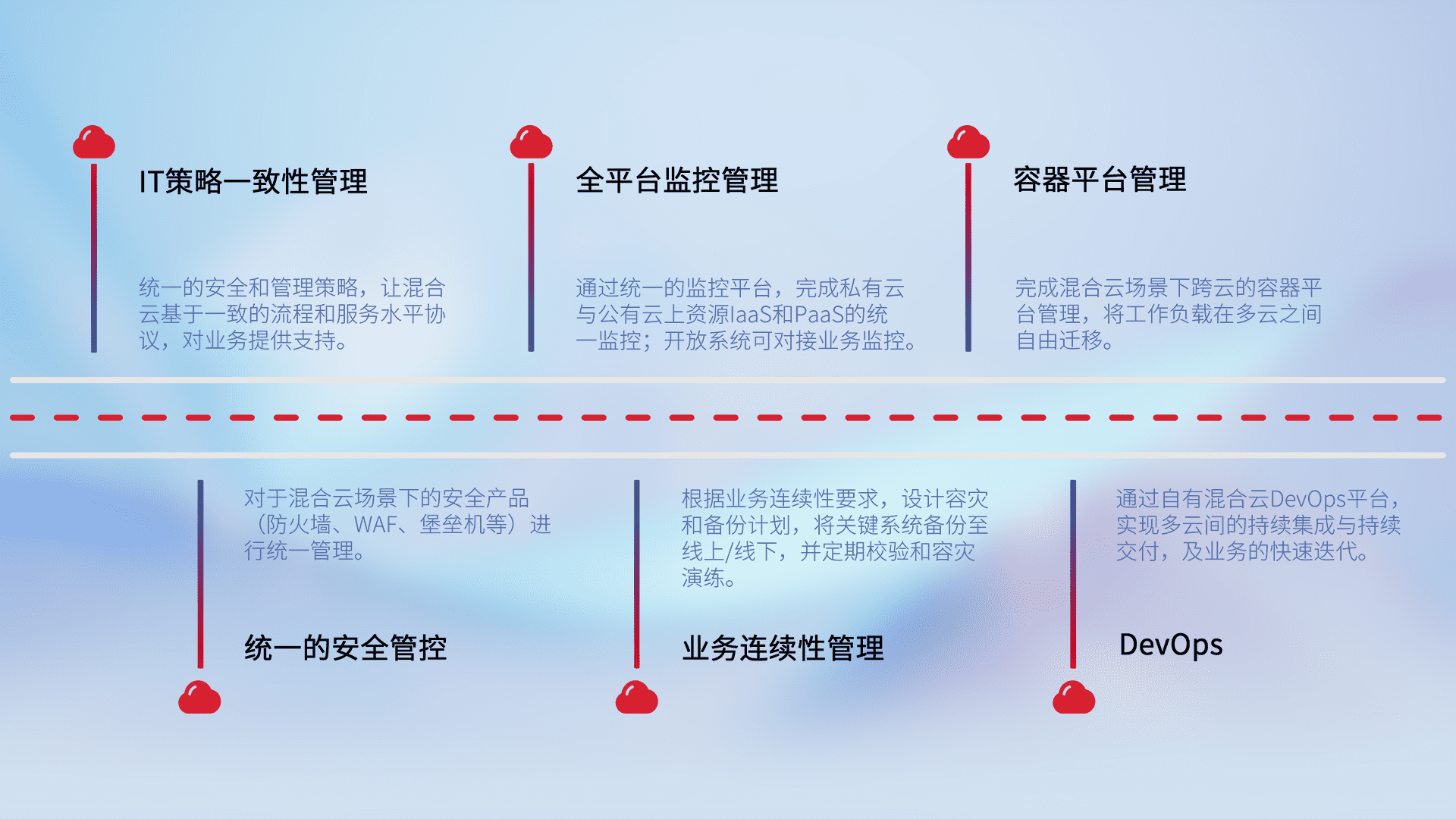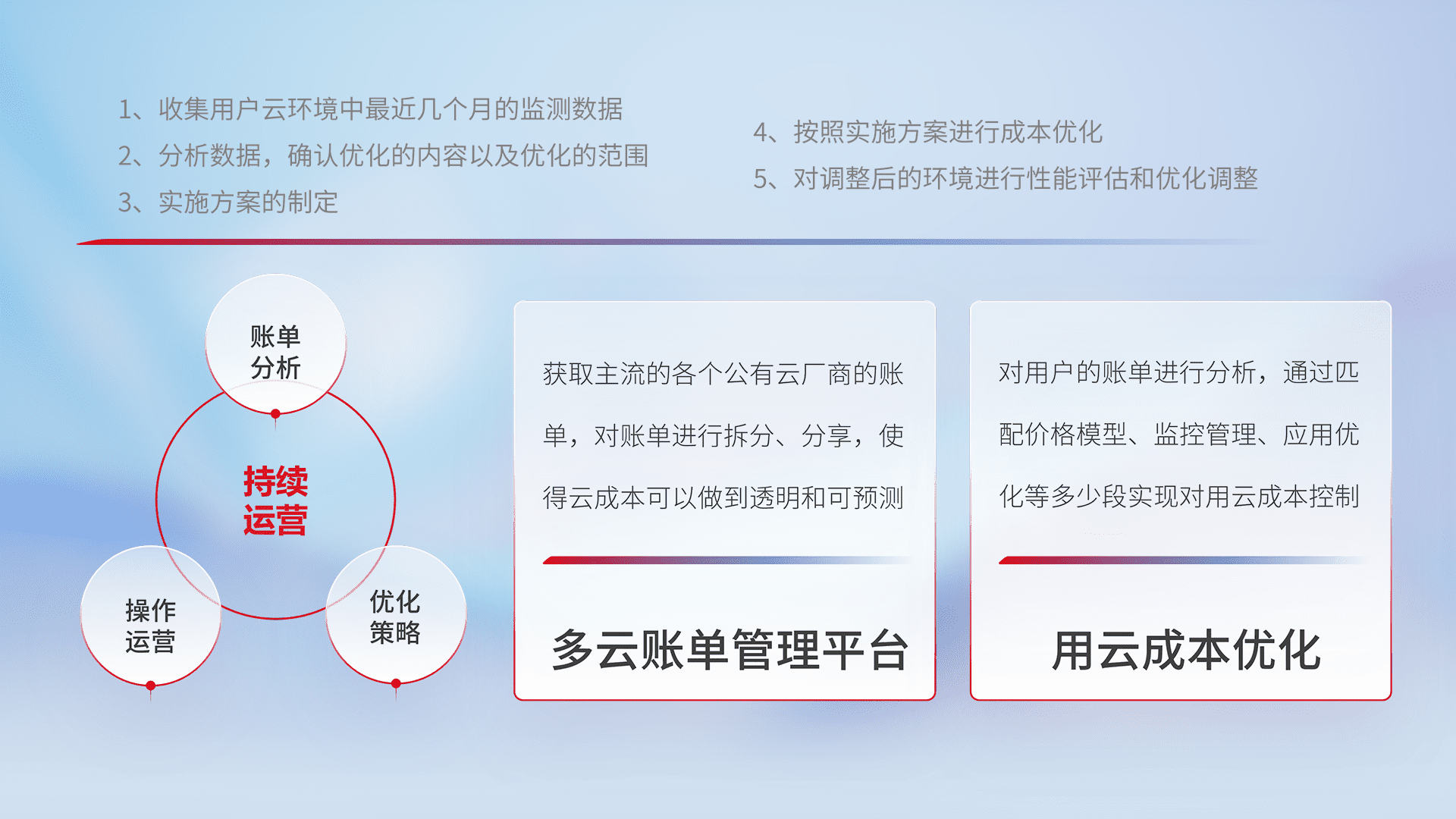 通过多云纳管,,,以统一的资源数据模型把客户的云资源进行抽象和封装,,进而实现对多云资源的统一操作,,保障云资源管理的可靠性、、、、稳定性与可用性。。。量身定制化运维内容,,,配置、、开发运维、、补丁管理、、、备份、、、、监控、、认证和访问管理、、、审计和日常巡检等,,保障在用云过程中的可靠度,,,稳定度以及高可用率。。。
